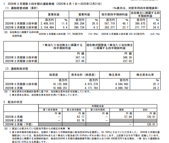 第3四半期の決算が発表されました。営業収益、営業利益、純利益が前年比より大幅に増加となりました。通期予想に対しての進捗率は89%と高いです。配当金は通期の業績から比率で決まります。通期の業績を達成した場合、配当金は153.67円と最低配当120.01円より30円以上の増配となります。