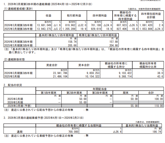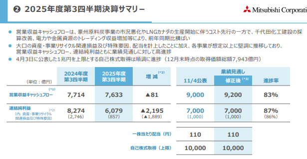第3四半期の決算が発表されました。売上や経常利益などは前年比より減少となっています。2025年通期の予想は前年比より減益予想から始まっているので、そこまでの驚きはありません。しかし、純利益が前年比より増加となっていました。また、通期の見通しが上方修正の発表がありました。さすが大手商社NO1の会社です。本決算での成績や増配に期待できます。