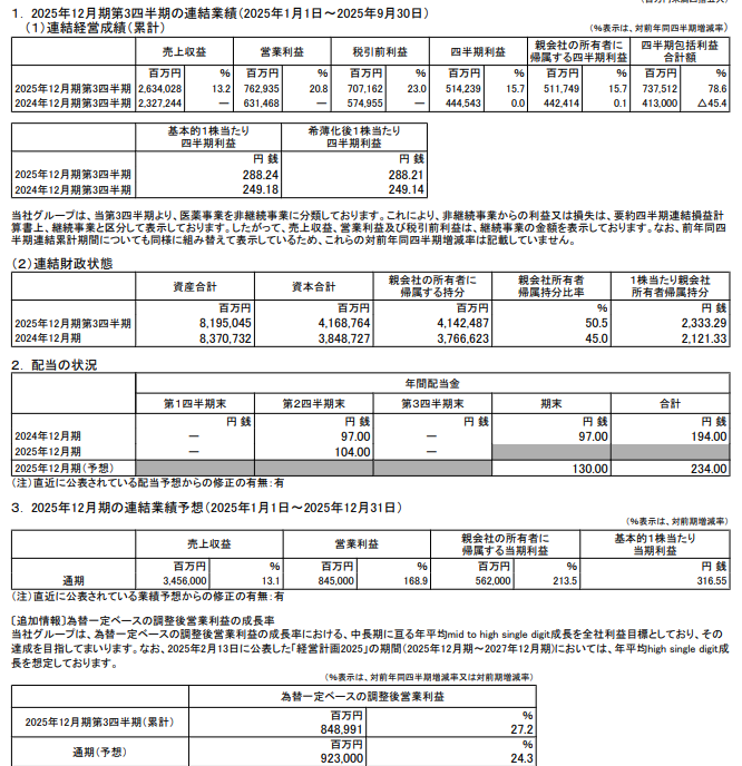 第3四半期の決算が発表されました。売上、EPS、利益ともに前年より大きく増加しています。また2025年度の売上や利益が上振れる見込みとなり、上方修正が発表されました。利益が多くでるというため、期末配当が26円の増配発表もありました。配当金が増えるのは良いニュースです。