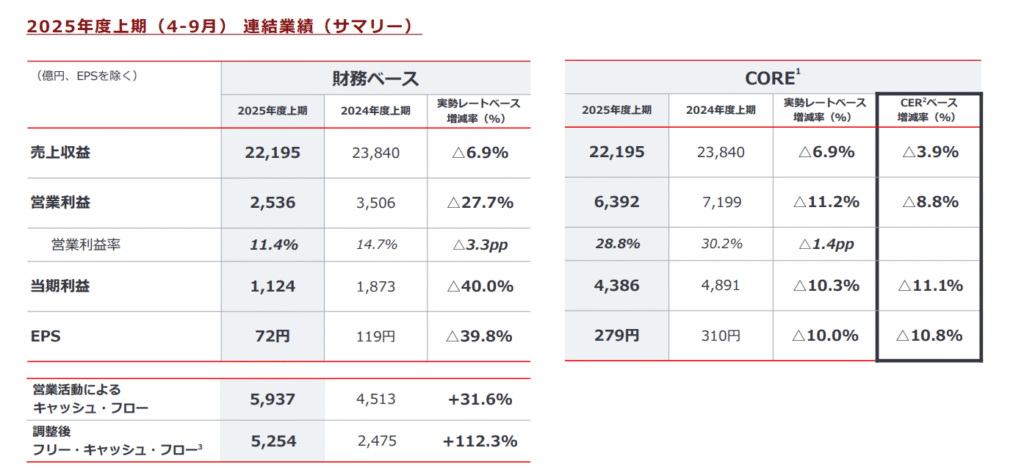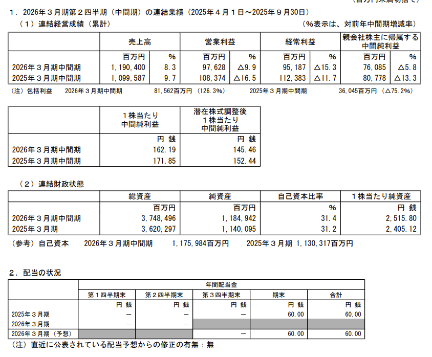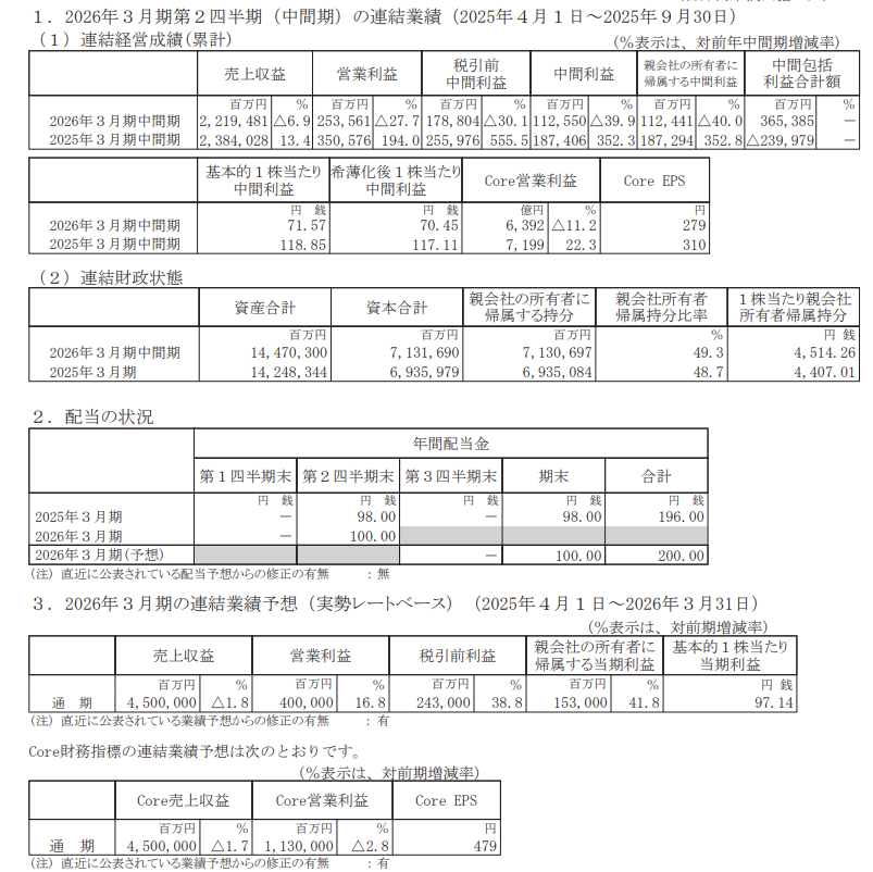中間報告が発表されました。前年度より利益が大きく減少しEPSも悪化となりました。配当金は期初の見込み通り半期100円となっています。後半の巻き返しに期待です。